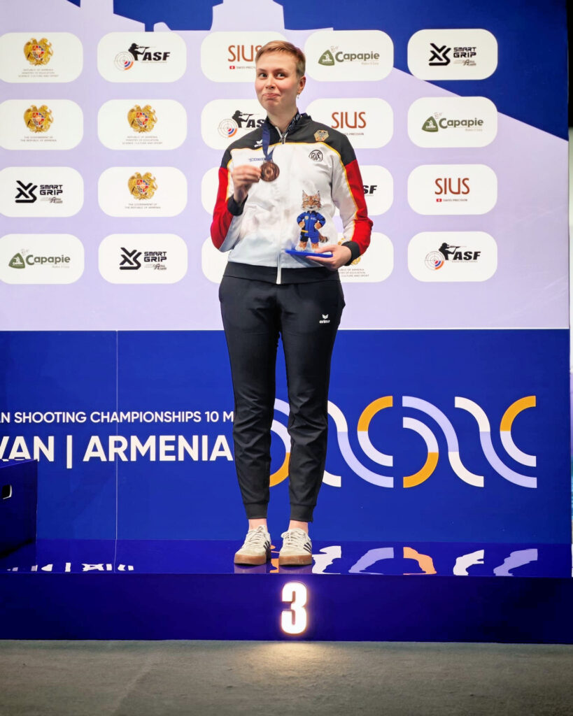 Bei der Druckluft EM in Eriwan setzte Hanna nadlos an ihre letzten Erfolge bei H&N Cup an. Gestartet wurde in die EM am 1. März mit dem Mixed Wettbewerb Luftgewehr. Zusammen mit Maximilian Dallinger erreichte Hanna Platz 23. Einen Tag später ging es weiter mit dem 10m Wettbewerb im Einzel- und der Mannschaftswertung. Am Ende war es Platz 17 im Einzel mit 630,9 Ringen. Bei der ersten Serie (103,9) tat sich Hanna noch etwas schwer, am Ende fehlten zum Finaleinzug ein Ring. In der Mannschaftswertung war es Platz 4 mit ebenfalls einem Ring Rückstand auf die Bronzemedaille. Am 3. März stand der Teamwettbewerb an. Über Qualifikation, Viertel- und Halbfinale ging es ins Finale. Dort musste sich die Deutsche Mannschaft mit Hanna Bühlmeyer, Anna Janßen und Hannah Steffen-Dix nur den ‚bärenstarken‘ Norwegern geschlagen geben. So gab es die erste Silbermedaille in der Mannschaftswertung für Hanna. Am Mittwoch, den 4. März stand der letzte Wettbewerb der EM an – der Solowettbewerb der Frauen. Bei diesem Wettbewerb wird ein Schuss als Treffer gewertet, wenn er einen Wert von mindestens 10,3 Ringen hat. Und hier schlug Hanna zu. In der 1. Runde belegte Hanna mit 26 Treffern Platz 11 und in der 2. Runde waren es sogar 28 Treffer, zusammen 54 Treffer (von 60 möglichen). Das bedeutete in der Endabrechnung Platz 3 mit einem Treffer Rückstand auf Platz 2. Damit ging Hanna ins Bronze Match. Dort war sie dann mit 15:14 Treffern siegreich, belegte Platz 3 und hatte damit ihre erste Medaille bei einer EM gewonnen. Wir sagen Herzlichen Glückwunsch an Hanna.
